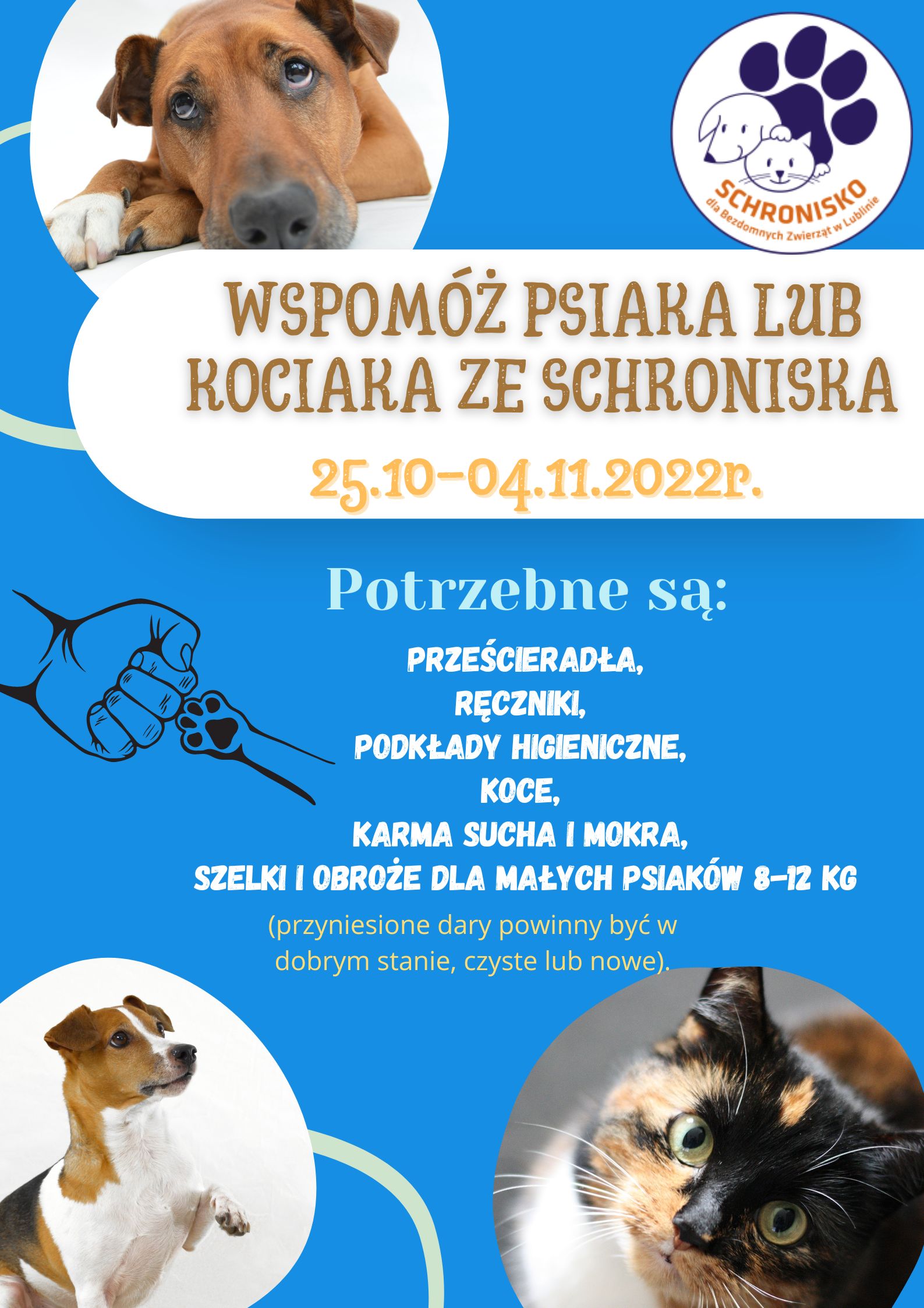 Zapraszamy do udziału w zbiórce charytatywnej. Celem naszej zbiórki jest wsparcie funkcjonowania Schroniska dla Bezdomnych Zwierząt w Lublinie.